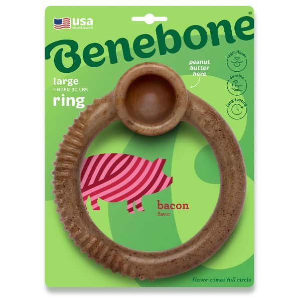 הלהיט החדש של בנבון! בנבון טבעת בייקון! צעצוע לעיסה חזק במיוחד, יעסיק את כלבכם במשך שעות רבות ואפילו את "הלועסים" החזקים ביותר! ריח וטעם אמיתי מחזיר את כלבבכם להתעסק עם הצעצוע פעם אחר פעם במשך שעות רבות של עניין וכיף! לטבעת גומה אשר ניתן למלא בחמאת בוטנים, פינוקים רטובים, מחיות וממרחים לאקסטרא עניין, ליקוק ותעסוקה!- צעצוע הלעיסה הנמכר והטוב בעולם