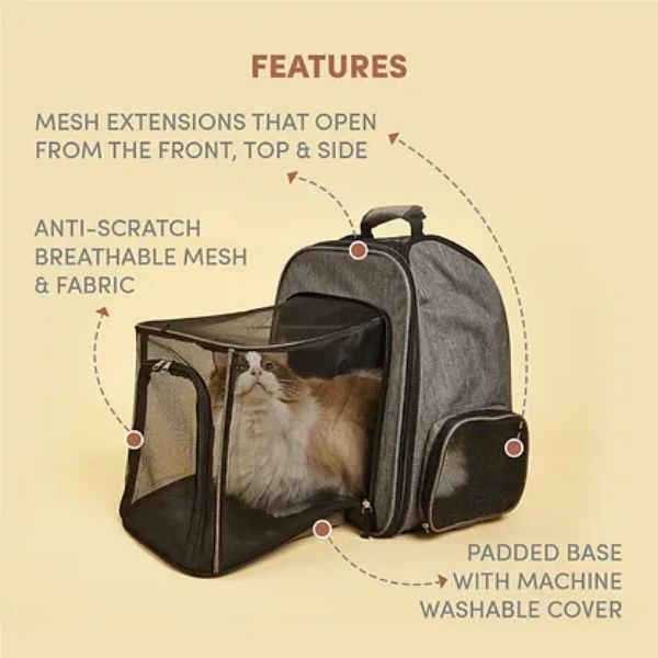 - אחסון פונקציונלי: כיס גדול עם רוכסן למזון, צעצועים ופינוקים. כיס צדדי כולל שקע אוזניות לאחסון נוסף.